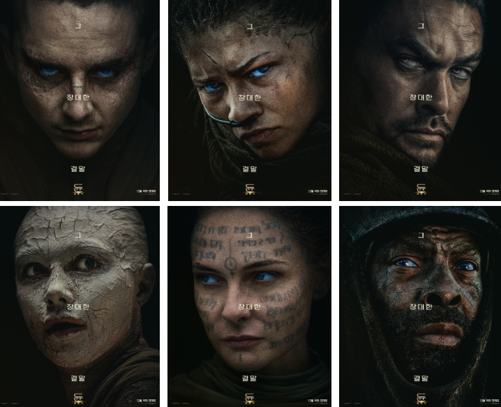 함께 공개된 캐릭터 포스터는 우주의 운명을 건 순간을 맞이하는 인물들의 결의에 찬 모습을 집약적으로 담아내며 시선을 사로잡는다. 절대 권력으로 흑화한 '폴' 역의 티모시 샬라메와 '폴'을 사랑하지만 결국 대립하게 되는 '챠니' 역의 젠데이아를 비롯해 플로렌스 퓨, 레베카 퍼거슨, 안야 테일러-조이, 하비에르 바르뎀 등 전편의 캐릭터들이 다시 한번 의기투합해 극의 무게감을 더한다.