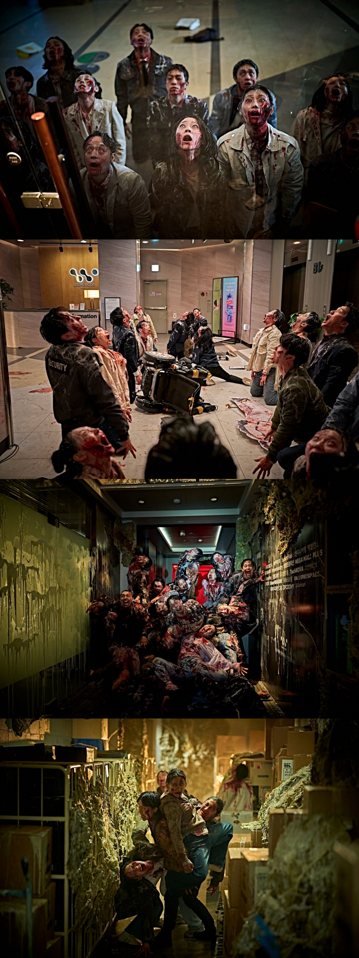 이어, 양쪽 발목이 꺾인 채 몸을 일으키는 감염자의 스틸은 네 발로 기다가 두 발로 서는 진화의 순간을 포착해, 기존 좀비와는 차별화된 움직임을 생생하게 전달한다. 점액질로 뒤덮인 유리문 밖으로 보이는 감염자들의 실루엣 역시 낯설고 기묘한 분위기를 만들며, 과연 이 점액질의 정체가 무엇일지 궁금증을 고조시킨다.
