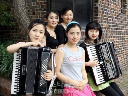 탈북자 여성그룹 달래음악단이 영화 '공동경비구역 JSA' 세트장에서 뮤직비디오를 촬영한다.