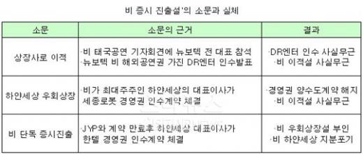 그런데 이지분이 화근이 돼 비는 증시진출설에 휘말렸다. 하얀세상 대표인 김우창씨가 한텔의 경영권을 인수하면서 소문은 더 커져 올해 5월부터 비가 독립회사를 통해 증시에 진출한다는 설이 꾸준히 제기됐다.