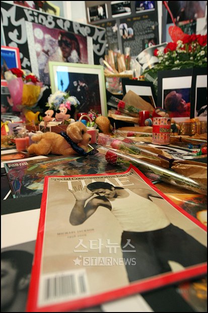 연예K-POP[★포토]잭슨 그리워하는 한국 팬들의 마음발행 : 2009.10.28 ・ 21:39유동일 기자28일 오후 서울 왕십리 CGV에서 마이클 잭슨의 생전 마지막 런던 컴백 공연을 중심으로 리허설을 담은 영화 '마이클잭슨의 디스이즈잇' VIP시사회에서 잭슨 팬들이 놓은 추모 물건들이 진열되어 있다.<저작권자 © 스타뉴스, 무단전재 및 재배포 금지>마이클 잭슨추천 기사좋아요 연예-K-POP의 인기 급상승 뉴스연예-K-POP의 최신 뉴스