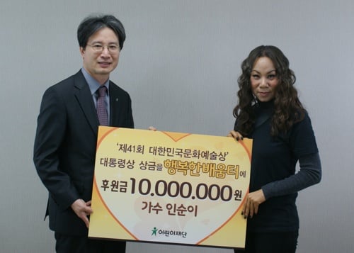 7일 어린이재단에 따르면 인순이는 지난 4일 기증식 대한민국문화예술대상 대통령상 상금 1000만원 전액을 어린이재단의 행복한 배움터에 기증했다.