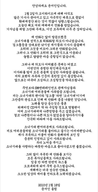 그는 "노래를 항상 듣는 것은 물론 리패키징 CD까지 다 구입할 정도로 열혈팬이 어찌 소녀시대에게 나쁜 영향을 주고 싶겠나"라며 "결코 나쁜 뜻이나 나쁜 의도가 없었음을 알아주시기를 간곡히 바라며 거듭 사과 드린다"라고 밝혔다.
