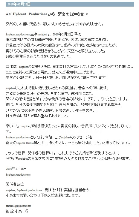 고 누자베스의 소속사는 18일 공식홈페이지를 통해 "누자베스가 지난달 26일 심야 도쿄 미나토구에서 교통사고를 당해 인근 시부야의 한 병원으로 후송했지만 사망했다"고 밝혔다.
