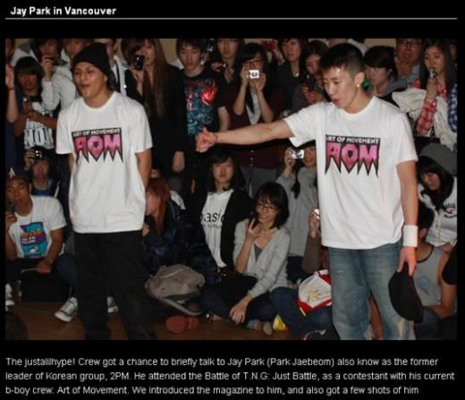 밴쿠버 HYPE 매거진은 "한국그룹 2PM의 전 리더로 알려진 Jay Park(박재범)과 잠깐 얘기할 기회가 있었다"며 "재범은 그의 비보이 크루인 '아트 오브 무브먼트(Art of Movement, 이하 A.O.M)와 'T.N.G:Just Battle' 대회에 참가했다"고 전했다.