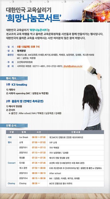 '희망나눔콘서트'는 '조전혁 대책위원회' 주최로 13일 오후 7시 청계광장에서 가수 애프터스쿨, M4, 박혜경, 남궁옥분, 심현섭, 박준형 등이 출연해 열릴 계획이었다. 그러나 이 콘서트가 전교조명단을 공개한 조전혁 의원을 돕기 위한 정치색 띤 공연이라며 논란이 되자 출연 예정 연예인들은 모두 참석을 취소했다.