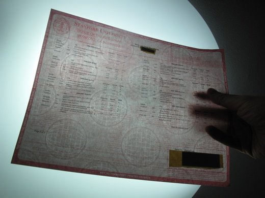 이번에 공개한 성적증명서는 불빛에 비추면 지구본 모양의 아이콘이 나타난다. 이는 'To verify: translucent globe icons must be visible when held toward a light source(진본임을 확인하기 위해서는 광원에 비추면 투명지구본의 아이콘이 보인다)'는 문구대로다.
