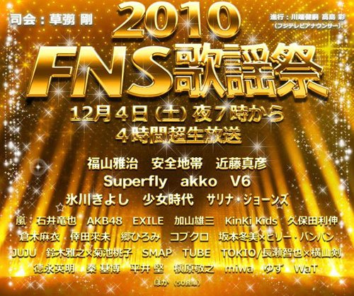 한편 FNS가요제는 12월4일 오후 7시부터 4시간동안 생방송으로 진행되며 인기그룹 SMAP의 쿠사나기 츠요시가 사회를 맡는다.