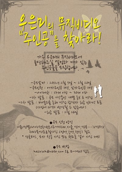 우은미는 5일 자신의 트위터를 통해 "저의 네번째 곡 뮤직비디오의 주인공이 돼주실 두 분을 찾습니다!"라는 글과 모집 공지문을 올렸다.