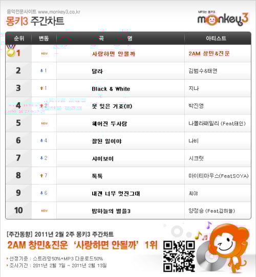 14일 음악전문사이트 몽키3는 '드림하이' OST 수록곡인 2AM 창민과 진운의 '사랑하면 안될까'가 2월 2주(2월 7일~2월 13일) 주간차트 1위에 올랐다고 밝혔다.