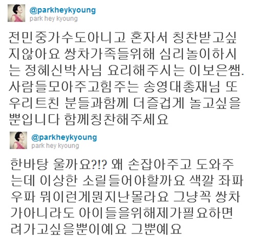 박혜경은 24일 오전 10시께 자신의 트위터에 "리트윗 중지! 이 기사 싫어요. 저는 민중가수도 아니고 혼자서 칭찬받고 싶지 않아요… 쌍차 가족들 위해 심리놀이하시는 정혜신 박사님, 요리해주시는 이보은 선생님, 사람들 모아주고 힘주는 송영대 총재님… 또 우리 트위터 친구들과 함께 더 즐겁게 놀고 싶을 뿐 입니다! 함께 칭찬해주세요"라는 글을 게재, 단독 진행하는 것이 아님을 분명히 했다.