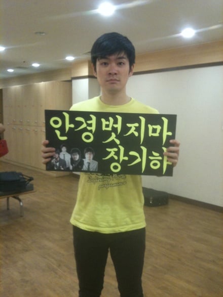 사진에는 팬의 간절한 바람에도 불구 안경을 벗은 장기하가 카메라를 응시하고 있다. 그는 '안경 벗지 마'라는 글귀가 새겨진 플래카드를 당당히 들고 있어 웃음을 자아낸다.