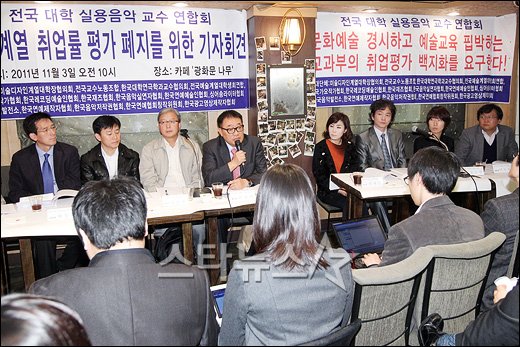 예술계열 취업률 평가 반대를 요구하는 전국 미술,디자인계열 대학장협의회 배동석 사무처장, 대학 연극학과 교수 협의회 신동인 총무, 한국 대학 교수 노동조합 강남훈 위원장, 전국 대학 실용음악 교수 연합회 이정선 회장, 가수 장혜진, 교수 장기호, 전국 예술계열 대학생 연합 조소연 의장, 작곡가 마도원(왼쪽부터)이 3일 오전 서울 종로구 교육과학기술부 청사 인근 카페에서 기자회견을 갖고 있다.
