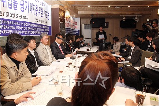 예술계열 취업률 평가 반대를 요구하는 교수 손무현, 가수 반선주, 전국 미술,디자인계열 대학장협의회 배동석 사무처장, 대학 연극학과 교수 협의회 신동인 총무, 한국 대학 교수 노동조합 강남훈 위원장, 전국 대학 실용음악 교수 연합회 이정선 회장, 가수 장혜진, 교수 장기호, 전국 예술계열 대학생 연합 조소연 의장, 작곡가 마도원이 3일 오전 서울 종로구 교육과학기술부 청사 인근 카페에서 기자회견을 갖고 있다.