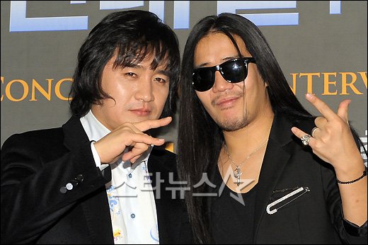 가수 신대철과 박완규가 5일 오후 서울 서초구 팔래스호텔에서 열린 '케이록 에볼루션(K-Rock Evolution)' 기자간담회에 참석해 포즈를 취하고 있다.