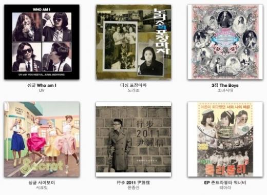 이밖에 노라조가 5월 내놓은 디싱 '포장마차'는 고색창연한 흑백사진으로 분위기를 달궜고, 소녀시대의 정규 3집 'The Boys'는 멤버 9명의 초상화를 마치 앤틱 액자 스타일로 꾸며 클래시컬한 느낌을 잘 살렸다. 시크릿의 싱글 '샤이보이'도 1950, 60년대 '풍요로운 미국' 젊은 여성들의 원색적인 이미지, 윤종신의 '行步 2011 尹鍾信'도 세월이 묻어나는 담벼락에 기댄 윤종신(헤어스타일마저도!)의 흑백 화면을 포착했다.