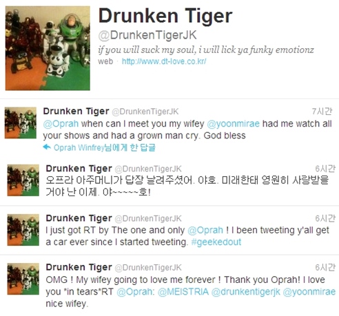 타이거 JK는 19일 자신의 트위터에 "오프라 아주머니가 답장 날려주셨어. 야호 미래한테 영원히 사랑받을 거야 난 이제. 야~호!"라는 글을 올렸다.