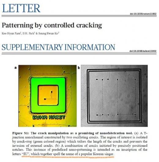 IU라는 글자가 새겨진 흑백사진 아래 한 문장에는 "이 나노패턴 예시의 의도는 한국 유명 가수인 IU의 글자를 새기기 위한 것이다"라고 적혀 있어 눈길을 끈다.