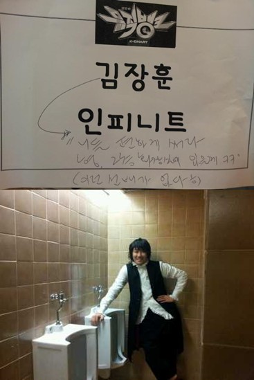 공개된 사진은 KBS 2TV '뮤직뱅크' 대기실에 붙은 사용자 명단으로, 인피니트와 같은 대기실을 사용하게 된 김장훈은 후배들이 불편해 할 것을 감안해 "니들 편하게 써라. 형, 2층 화장실에 있을게. 이런 선배가 없다"라는 글을 적으며 남다른 후배사랑을 드러냈다.