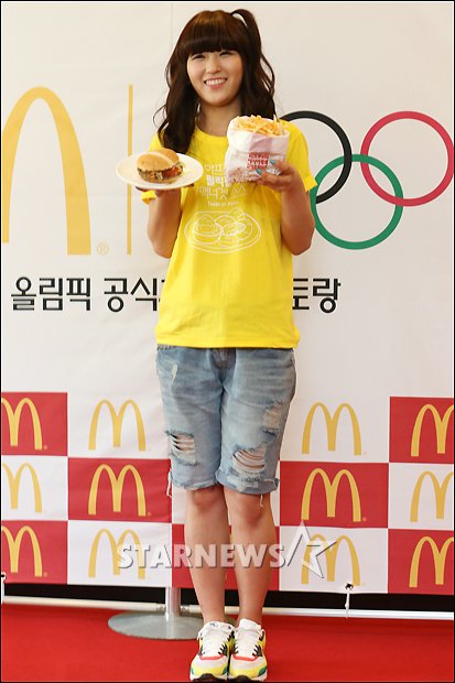 걸그룹 글램의 이미소가 25일 오전 서울 코엑스 맥도날스점에서 2012 런던 올림픽을 맞아 다양한 대륙의 맛을 선보이는 '올림픽 5대륙 6메뉴' 출시를 기념해 올림픽 메뉴를 선보이고 있다.