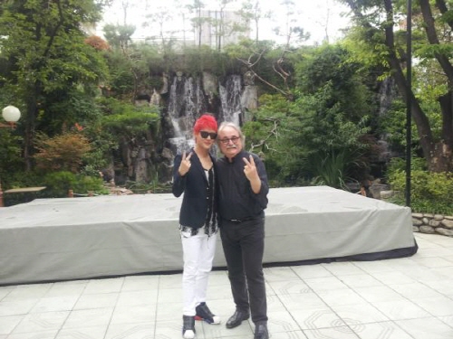 공개된 사진 속 김준수는 붉은색의 파격적인 헤어스타일을 하고 실베스터 르베이와 함께 브이를 하며 포즈를 취하고 있다. 스승과 제자의 다정한 모습이 눈길을 끈다.