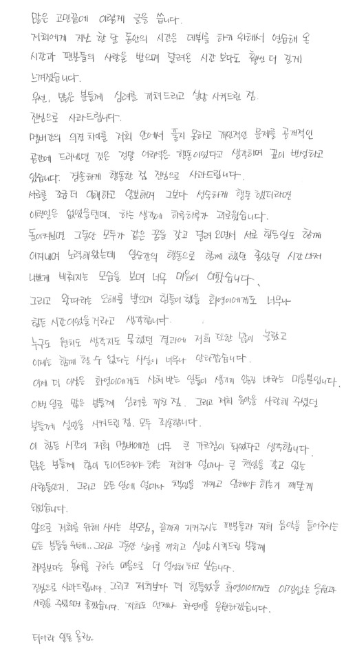 멤버 화영의 탈퇴로 왕따 논란을 겪었던 걸그룹 티아라가 자필 사과문을 공개했다.