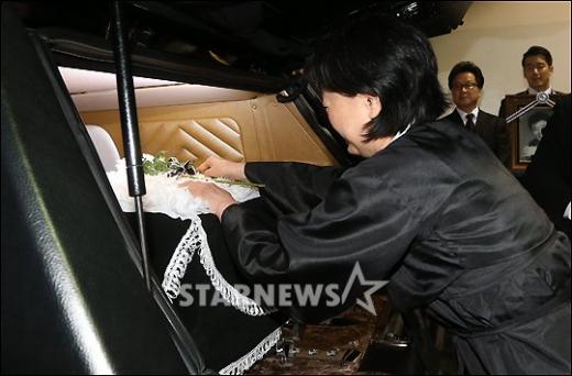지난 10일 지병으로 숨진 가수 고 최헌(64)의 발인식이 12일 오전 서울 광진구 건국대학교 장례식장에서 열린 가운데 부인 배영혜씨가 오열하고 있다.