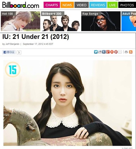 '21 Under 21: Music's Hottest Minors 2012'는 각종 음악 차트에서 활약하고 있는 21세 이하 뮤지션 스타 21명을 선정한 차트로, 전 세계 음악 차트에서 영향력 있는 뮤지션을 꼽았다. 아이유는 15위에 랭크돼 팝스타들과 어깨를 나란히 했다.