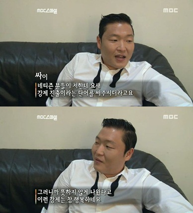 싸이는 이날 제작진과의 인터뷰에서 "네티즌 분들이 요새 나한테 '강제 진출'이라는 단어를 써주더라"며 "뜻하지 않게 나왔다고 그런 단어를 써주시는데 이런 강제는 참 행복하다"고 말했다.