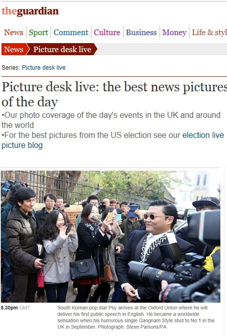 가디언은 싸이의 사진에 대해 "한국의 팝 스타 싸이가 영국에서 공식적인 첫 연설을 하기 위해 옥스퍼드대학 특별 강의장인 옥스퍼드 유니언 강연회장에 도착했다"며 "싸이는 싱글 '강남스타일'로 지난 9월 UK차트에서 1위를 차지했다"고 부연했다.