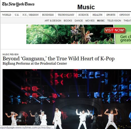 뉴욕타임즈는 10일(현지시간) '강남스타일을 넘어선 K팝의 심장(Beyond 'Gangnam' the True Wild Heart of K-Pop)이란 기사를 올려 빅뱅의 콘서트 현장을 전했다.