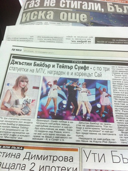 공개된 사진 속 불가리아 신문은 2012 MTV 유럽 뮤직 어워드(이하 MTV EMA 2012)'에서 공연을 펼치고 있는 싸이의 모습을 담았다.