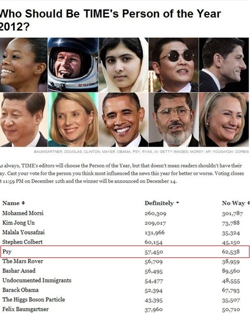 29일(이하 한국시간) 미국의 시사주간지 타임의 공식홈페이지에 따르면 싸이는 이날 오후 4시 현재 5만7450표를 얻어 5위를 기록 중이다. 타임지가 이 부문 후보를 공개한 직후인 지난 27일 기록한 순위(13위)보다 8계단 상승했다.
