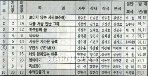 한편 신승훈의 '보이지 않는 사랑'과 함께 1991년 정규 1집에 함께 실렸던 '우연히(Remix)'(작사작곡 박광현)가 6위까지 올라온 점이 눈길을 끈다. 리믹스 버전이 함께 실린 오리지널보다 더 인기를 끈 것이다. 이현우의 '꿈' 리믹스 버전이 크게 인기를 끈 해도 역시 1992년이었다. 어쨌든 '우연히(Remix)'는 4월13일자 DJ차트에서 마침내 1위에 오른 후 무려 8주 연속 톱을 달리며 '신승훈 신화'를 완성했다.