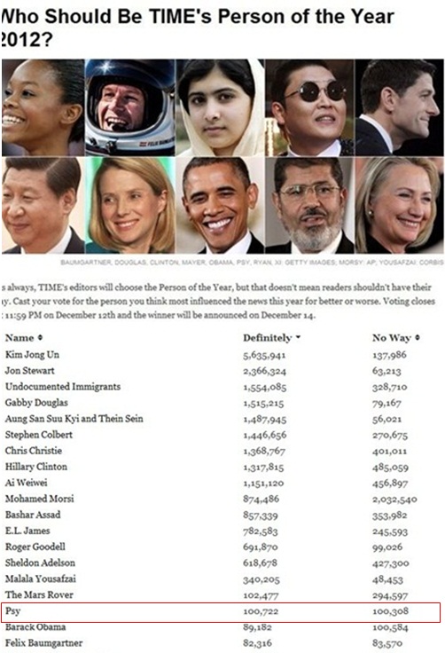 중위권에 해당하는 기록이지만 싸이는 일찌감치 김정은 북한 국방위원회 제1위원장, 버락 오바마 미국 대통령, 힐러리 클린턴 미 국무장관, 무함마드 무르시 이집트 대통령 등 세계적인 유명인사와 함께 후보로 거론되며 글로벌 영향력을 입증했다.