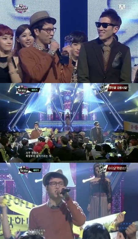 이로써 배치기는 지난달 31일 방송된 케이블 채널 엠넷 '엠카운트다운'에서 생애 첫 1위를 차지한 데 이어 연일 상승세를 타게 됐다.