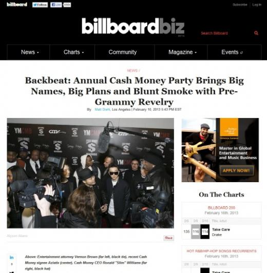 3인 R&B 힙합그룹 아지아틱스(에디신 플로우식 니키리)가 미국 굴지의 레코드 레이블인 캐시머니(Cash Money Records)와 1130만 달러에 이르는 대형 계약을 맺은 가운데, 이 사실을 미국 빌보드 역시 주목했다.