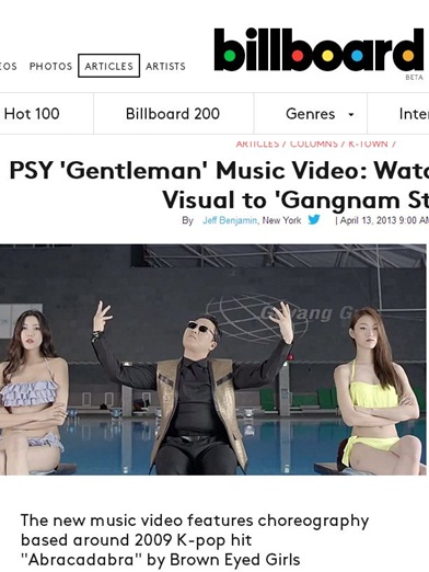그는 또한 "'젠틀맨'에서 미묘하게 엉덩이를 흔드는 동작은 그녀가 속한 그룹의 히트곡 '아브라카다브라'에서 차용한 안무"라며 "싸이는 과거 '젠틀맨' 포인트 안무에 대해 한국인들은 잘 알고 있는 동작이라고 귀띔한 바 있다"고 설명했다.