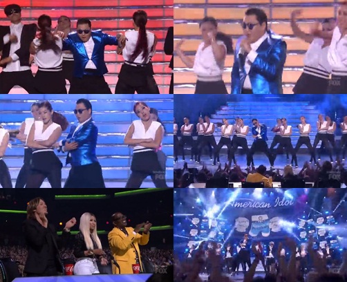싸이는 16일 오후(현지시간) 미국 캘리포니아주 LA에서 생방송으로 진행된 미국 폭스TV '아메리칸 아이돌 시즌12' 파이널 축하 무대에 올랐다.