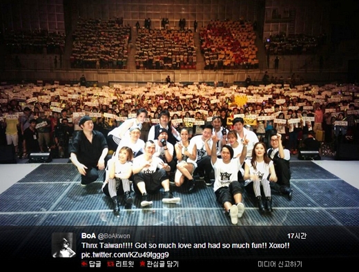 보아는 18일 대만 첫 단독 콘서트 성공리에 끝낸 직후 자신의 트위터에 "대만 고마워요. 많은 사랑을 받았고, 너무나 즐거웠어요"라는 글과 함께 대만에서 찍은 사진 한 장을 게재했다.