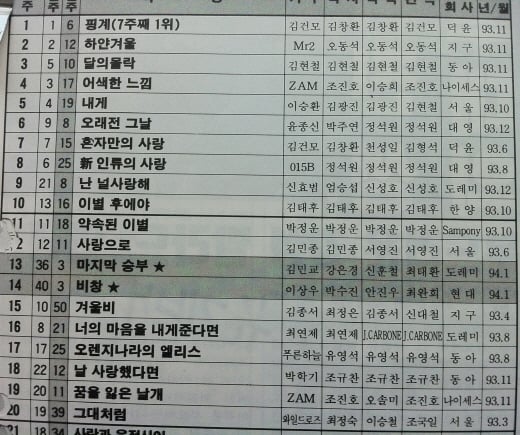 이밖에 1994년 3월 첫째주 차트에서는 부활의 '사랑할수록'이 전주 63위에서 56위로 뛰어올랐고 바비킴이 멤버로 활약한 닥터레게의 '어려워 정말'이 전주 87위에서 66위로 급상승한 점이 눈길을 끈다. 신곡 중에서는 그룹 모노(박정원 이홍래 김보희)의 '넌 언제나'가 85위, 듀스(고 김성재 이현도)의 2집 수록곡 '우리는'이 90위로 차트에 처음 진입, 향후 폭풍 인기의 서곡을 알렸다.