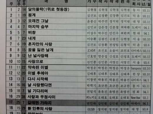 ;차트 순위에서 보듯 발라드 음악이 강세를 보이고 있는 점이 눈길을 끈다. 윤종신이 93년 발표한 3집 수록곡이자 지금도 자주 불려지는 '오래전 그날'(박주연 작사, 윤종신 작곡)을 비롯해 SBS 드라마 '결혼' OST인 이상우의 '비창', 박학기의 '날 사랑했다면', 권인하의 '갈테면 가라지', 이승환의 '내게', 신효범의 '난 널 사랑해', 김민종의 '사랑으로', 박정운의 '약속된 이별', 김태후의 '이별 후에야' 등이 인기를 끌었다. '마지막 승부' '다시 시작해' 등 MBC드라마 '마지막 승부'의 OST 인기도 여전했다.