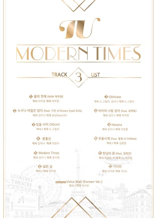 소속사 로엔엔터테인먼트는 오는 7일 공개되는 아이유의 정규 3집 '모던타임즈(Modern Times)'의 트랙리스트를 23일 공개했다.