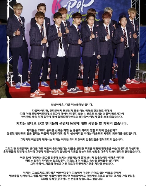 엑소 플래닛 측은 "저희는 절대로 엑소 멤버들의 군 면제 동의에 대한 서명을 할 계획이 없다"라며 "저희들은 엑소가 올바른 선택을 하면 늘 응원과 격려의 말을 아끼지 않을 것이고 잘못된 방향으로 걸음 할 때는 마음이 아플지라도 좀 더 성숙해지길 바라는 마음으로 사랑의 회최리를 들 것"이라고 밝혔다.