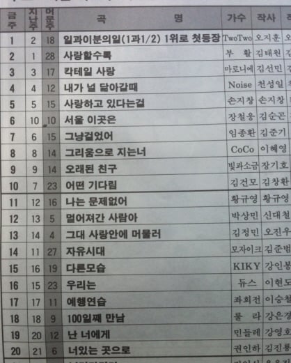 투투의 '일과 이분의 일', 마로니에의 '칵테일 사랑', 임종환의 '그냥 걸었어', 모자이크의 '자유시대', 룰라의 '100일째 만남', 부활의 '사랑할수록'..지금도 종종 듣거나 노래방에서 부르게 되는 이 노래들이 한 차트 톱20에서 격돌한 일이 있으니 바로 1994년 7월 셋째주 한국DJ클럽 가요차트였다.