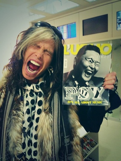 사진에는 스티븐 타일러가 싸이의 화통한 웃음이 담긴 잡지를 든 채, 이를 따라한 모습이 담겼다. 두 눈을 질끈 감고 입을 크게 벌려 웃는 모습이 보는 이들을 폭소케 했다.