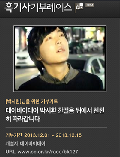 '흑기사 레이스'는 축하나 응원을 해주고 싶은 사람의 이름으로 모금을 진행할 수 있는 기부 행사. '데이바이데이' 회원들은 온라인(www.sc.or.kr/race/bk127)에 모금방을 만들고 오는 15일까지 모금을 진행 중이다.