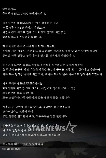 발전소 측은 "온 국민이 슬픔이 빠진 가운데 즐겁게 공연을 진행할 수 없다는 판단 아래 직원들과 아티스트 회의를 통해서 이와 같은 결정을 내리게 됐다"라며 "세월호의 생존자 구조 소식을 간절히 기다리며 고인과 유가족 분들에게 깊은 애도의 뜻을 전한다"라고 덧붙였다.