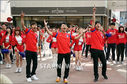 더 프렌즈와 피에스타가 14일 오후 경기도 고양시 일산서구 대화동 원마운트에서 열린 '피에스타 & 더프렌즈, 월드컵 공식 응원가' 뮤직비디오 촬영을 하고 있다.