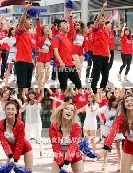 그룹 더 프렌즈(김형중 이장우 조성민)와 피에스타(재이 린지 예지 혜미 차오루)는 이날 붉은 악마 선정 월드컵 공식 응원가 '아이 러브 코리아(I Love Korea)' 뮤직비디오를 촬영하기 위해 한 자리에 모였다.